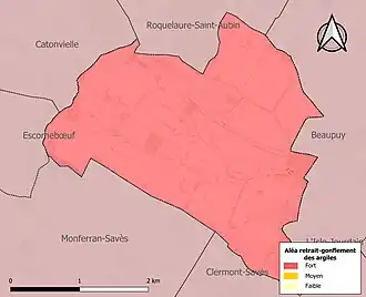 Le retrait-gonflement des sols argileux est susceptible d'engendrer des dommages importants aux bâtiments en cas d’alternance de périodes de sécheresse et de pluie. La totalité de la commune est en aléa moyen ou fort (94,5 % au niveau départemental et 48,5 % au niveau national). Sur les 88 bâtiments dénombrés sur la commune en 2019, 88 sont en aléa moyen ou fort, soit 100 %, à comparer aux 93 % au niveau départemental et 54 % au niveau national. Une cartographie de l'exposition du territoire national au retrait gonflement des sols argileux est disponible sur le site du BRGM[21],[Carte 3].