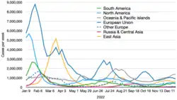 Durant l'été 2020, le virus circule beaucoup plus qu'au début de la première vague en janvier - avril[13]. D'après l'OMS, le nombre de cas en semaine 35 (fin août), 239 454 pour la région Europe de l'OMS est quasiment le double de la semaine 23 (début juin)[29].