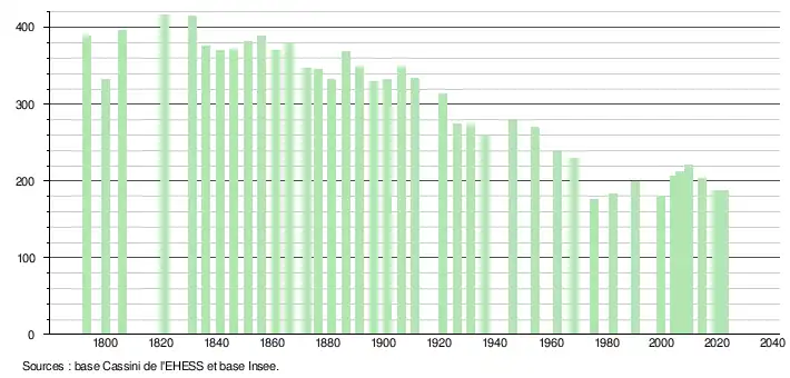 - ↑ Fiches Insee - Populations de référence de la commune pour les années 2006, 2007, 2008, 2009, 2010, 2011, 2012, 2013, 2014, 2015, 2016, 2017, 2018, 2019, 2020, 2021 et 2022.