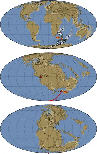 Des pôles d'âges différents sur un même continent, une plaque lithosphérique ou tout autre bloc tectonique peuvent être utilisés pour reconstruire une trajectoire de dérive polaire apparente (en) (Apparent Polar Wander Path ou APWP). Si les trajectoires de terrains adjacents sont identiques, cela signifie qu'il n'y a eu aucun mouvement relatif entre eux pendant la période couverte par la trajectoire. En revanche, la divergence des trajectoires de l'APWP indique que les terrains en question ont bougé de manière indépendante dans le passé, le point de divergence marquant le moment où ils se sont séparés[17]. Des APWP combinés ou synthétiques peuvent être construits en faisant pivoter les pôles paléomagnétiques de différentes plaques dans le cadre de référence fixé sur une seule plaque, en utilisant des estimations des mouvements relatifs des plaques[13]. Pour les époques postérieures à l'assemblage de la Pangée (il y a environ 320 millions d'années), les dérives polaires apparentes synthétiques sont souvent construites dans le cadre de référence fixé à la plaque africaine[13] car l'Afrique occupait une position centrale dans la configuration du supercontinent dont le morcellement a débuté au début du Jurassique, il y a environ 180 millions d'années.