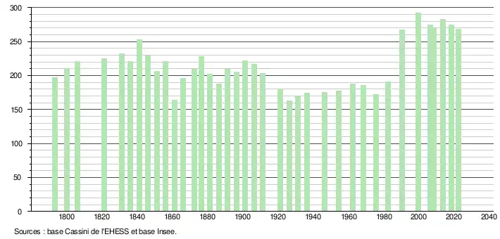 L'évolution du nombre d'habitants est connue à travers les recensements de la population effectués dans la commune depuis 1793. Pour les communes de moins de 10 000 habitants, une enquête de recensement portant sur toute la population est réalisée tous les cinq ans, les populations de référence des années intermédiaires étant quant à elles estimées par interpolation ou extrapolation[32]. Pour la commune, le premier recensement exhaustif entrant dans le cadre du nouveau dispositif a été réalisé en 2008[33].
