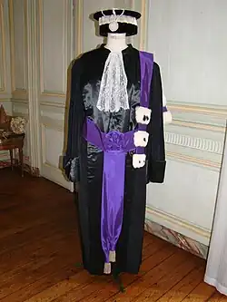 Il s’agit d’une robe universitaire, portée par le Chancelier des universités, tel que défini par le décret du 31 juillet 1809 « concernant le costume des membres de l’Université ».