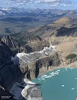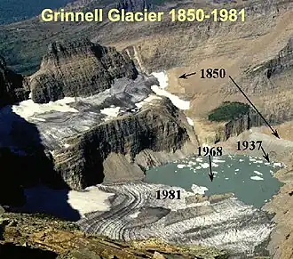 Sur les pentes abritées des crêtes les plus élevées du Parc national de Glacier au Montana, ses glaciers éponymes diminuent rapidement. Le National Park Service et le US Geological Survey ont constitué des plans de chaque glacier depuis des décennies. En comparant les photographies prises au milieu du XIXe siècle aux images contemporaines, on constate de manière évidente que les glaciers du parc ont reculé notablement depuis 1850. Des photographies répétées, pendant des décennies depuis cette époque, montrent clairement que les glaciers dans tout le parc, par exemple le glacier de Grinnell, reculent. Les glaciers plus grands ont maintenant approximativement un tiers de la taille qu'ils avaient en 1850, et des nombreux glaciers plus petits ont complètement disparu. En 1993, 27 % seulement de la zone de 99 km2 du Parc national de Glacier qui était couverte par des glaciers en 1850 restait couverte de glace[39]. Les chercheurs pensent que, d'ici 2030, la majeure partie de la zone glaciaire du Parc National de Glacier aura disparu à moins que les modèles courants du climat n'inversent leur cours[40]. Le glacier de Grinnell est juste un de ces nombreux glaciers du Parc national de Glacier qui sont bien documentés par des photographies depuis de nombreuses décennies. Les photographies ci-dessous démontrent clairement le recul de ce glacier depuis 1938.