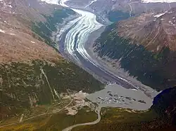 Les enregistrements à long terme du bilan de masse du glacier Lemon Creek en Alaska montrent un léger déclin avec le temps[48]. Le bilan annuel moyen pour ce glacier était, pendant la période de 1957 à 1976, de −0,23 m par an. Entre 1990 et 2005, le bilan annuel moyen était de plus en plus avait négatif, avec une moyenne de −1,04 m par an. Des mesures d'altimétrie (d'altitude) répétées, pour 67 glaciers d'Alaska, donnent que leur vitesse d'amincissement a augmenté de plus d'un facteur 2 entre la période allant de 1950 à 1995 (0,7 m par an) et celle allant de 1995 à 2001 (1,8 m par an)[49]. C'est une tendance systémique avec une perte de masse égale à la perte en épaisseur, qui conduit à des reculs croissants des glaciers — non seulement ils reculent, mais ils deviennent de plus en plus minces. Dans le parc national de Denali, le terminus du glacier de Toklat recule de 24 m par an et le glacier de Cantwell de 10 m par an[24]. Bien documentées en Alaska, il y a les surges glaciaires : ce sont des glaciers connus pour avancer rapidement, et parfois même de 100 m par jour, bien que les raisons pour lesquelles ils le font ne sont pas entièrement comprises[50]. Les glaciers Varigated, Black Rapids, Muldrow, Susitna et Yanert sont des exemples de surges glaciaires en Alaska qui ont eu des avances rapides dans le passé. Ces glaciers sont tous globalement en recul avec, de temps en temps, des courtes périodes d'avance.