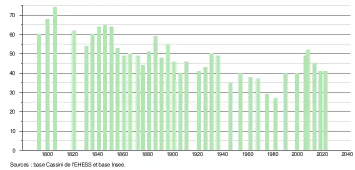 L'évolution du nombre d'habitants est connue à travers les recensements de la population effectués dans la commune depuis 1793. Pour les communes de moins de 10 000 habitants, une enquête de recensement portant sur toute la population est réalisée tous les cinq ans, les populations de référence des années intermédiaires étant quant à elles estimées par interpolation ou extrapolation[15]. Pour la commune, le premier recensement exhaustif entrant dans le cadre du nouveau dispositif a été réalisé en 2008[16].