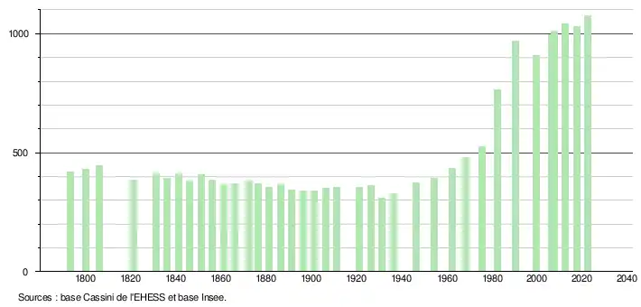 L'évolution du nombre d'habitants est connue à travers les recensements de la population effectués dans la commune depuis 1793. Pour les communes de moins de 10 000 habitants, une enquête de recensement portant sur toute la population est réalisée tous les cinq ans, les populations de référence des années intermédiaires étant quant à elles estimées par interpolation ou extrapolation[25]. Pour la commune, le premier recensement exhaustif entrant dans le cadre du nouveau dispositif a été réalisé en 2007[26].