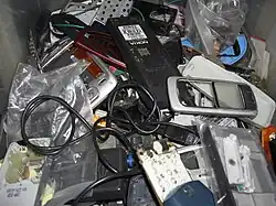Les téléphones portables ont une composition riche et complexe pour le recyclage[4]. Une tonne de téléphones portables contient 3 573 grammes d'argent, 368 grammes d'or et 287 grammes de palladium[5]. Les téléphones portables contiennent généralement les composants suivants : carte de circuit imprimé (PCB), écran à cristaux liquides (LCD), appareil photo, substrat flexible et moteur, et haut-parleur et microphone[4]. Ces composants sont fabriqués à partir d'éléments dangereux, précieux et de base[4]. Le circuit imprimé est composé de plomb, d'arsenic, d'or, d'argent, de cuivre, d'aluminium et d'autres métaux de base[4]. L'écran à cristaux liquides est composé d'or, d'argent, d'arsenic, de baryum, de cuivre et d'autres métaux de base[4]. L'appareil photo est composé d'argent, de cuivre et de nickel[4]. Le substrat flexible et le moteur sont composés d'argent, d'or, de cuivre et de platine[4]. Le haut-parleur et le microphone sont composés de cuivre, de manganèse et de zinc[4].