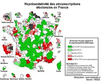 Par tradition remontant à 1875, reprise en 1958 et dans l'ordonnance de 1986, les départements ont au moins deux députés. Sans ce nombre minimum, par exemple en 1986, les Hautes-Alpes et la Lozère n'auraient eu droit qu'à un siège. Cette distorsion dans la représentation du corps électoral, quoique voulue et assumée par le législateur et le gouvernant, aboutit tout de même à ce qu'une voix d'un habitant de la Lozère vaut plus que trois voix d'électeurs dans les Bouches-du-Rhône. Pourtant, l'essentiel de la distorsion de représentation vient des évolutions démographiques constatables à long terme. Les chiffres qui servent à calculer les ratios de l'actuel redécoupage ne sont pas ceux du dernier recensement, celui de 1999, mais des données glissantes échelonnées sur les années 2004-2008, livrées par l'INSEE dans les premiers jours de [6], chiffres regroupés par circonscription existante à cette date par le ministère de l'Intérieur[7]. Selon ces dernières données destinées à servir d'étalon démographique, 18 départements ou collectivités d'outre-mer sont sous-représentés et doivent gagner au moins un siège, dont 3 doivent en gagner deux. Vingt-sept départements sont sur-représentés d'au moins un siège, dont 2 de deux sièges et 2 de trois sièges. La variation divergente de population entre départements a abouti à ce que par exemple trois habitants de Saône-et-Loire équivalent à cinq de La Réunion ; ou encore que trois de la Moselle ont le poids de quatre de la Haute-Garonne ; etc. L'évolution démographique aggrave la disparité à l’intérieur même des départements, alors que les députés d'un même département sont censés avoir le même poids démographique. Par exemple, dans le Var, la population de la première circonscription (partie sud de la ville de Toulon) est de 79 244 habitants, celle de la sixième (Brignoles) de 213 421, maximum constaté en 2004-2008, soit un rapport de 100 à 269, ou encore deux habitants pour la première comptant cinq de la sixième. Mais même dans certains départements qui ne doivent gagner ni ne perdre de siège, de graves distorsions de population entre circonscriptions sont apparues; c'est le cas dans les Alpes-Maritimes, l'Aude, les Bouches-du-Rhône, le Bas-Rhin, le Rhône, les Yvelines, la Guadeloupe, la Martinique et la Guyane. Les deux seules circonscriptions de ce département alignaient respectivement 65 803 et 140 151 habitants. La combinaison des deux facteurs trouve son expression extrême dans le fait qu'un habitant de la circonscription la moins peuplée de France (hormis les Collectivités d'outre-mer inférieures en population mais isolées), en Lozère, pèse autant que six habitants de la circonscription la plus peuplée, dans le Var.