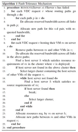 Cluster est un mécanisme de tolérance aux pannes qui traite les défaillances de serveur en migrant efficacement les machines virtuelles (VM) hébergées sur le serveur défaillant vers un nouvel emplacement[7]. Aujourd'hui, les fournisseurs de service du cloud préfèrent le centre de données virtuel (VDC) comme unité d'allocation des ressources que les centres de données physiques car les ressources allouées aux VDC peuvent être rapidement ajustées en fonction des besoins des locataires. L'architecture VDCs assure l'évolutivité en distribuant tout l'état de mappage virtuel-vers-physique, de routage et de réservation de bande passante dans les hyperviseurs de serveur. L'algorithme d'allocation VDC regroupe d'abord le réseau de serveurs en différents clusters. Le regroupement est effectué avec le nombre de sauts (hop count) en tant que métrique. Un serveur peut appartenir à plusieurs clusters, par ex. un cluster à deux sauts, un cluster à quatre sauts et l'ensemble du réseau. Lorsqu'un événement d'échec est signalé, l’algorithme essaye de trouver les requêtes dont les chemins de routage passent par le serveur défaillant. Pour ces chemins de routage affectés, de nouveaux chemins sont alloués. Nous effectuons cette opération avant d'essayer de réaffecter les machines virtuelles affectées (lignes 2-7). Après en désalloue les bandes passantes des chemins, qui connectent le serveur défaillant à d'autres serveurs hébergeant d'autres machines virtuelles dans le même VDC (lignes 9-10). Afin de réaffecter la VM, on essaye de trouver un serveur dans le même cluster, où le VDC est hébergé. Nous préférons le même cluster pour minimiser le délai de transmission et nous allouons ces ressources sur ce serveur et hébergeons la VM (ligne 11). Si un tel serveur n'est pas disponible dans le cluster actuel, nous passons à un cluster plus élevé[10].