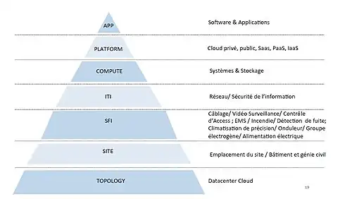 La redondance appliquée aux centres de données signifie que les services de base et les systèmes auront des doublons (équipement, liaisons, alimentation et chemins, données, logiciels…) afin de garantir les fonctionnalités dans l’éventualité où l’un de ces composants s’avérerait défaillant. Aujourd’hui, la « haute disponibilité » est pour l’essentiel obtenue par la redondance au niveau de tout l’écosysteme illustrée dans la figure. L’organisation « Uptime Institute » classe les centres de données en quatre niveaux : TIER I, II, III et IV. Ces niveaux correspondent à un certain nombre de garanties sur le type de matériel déployé dans le centre de données en vue d’assurer sa redondance.