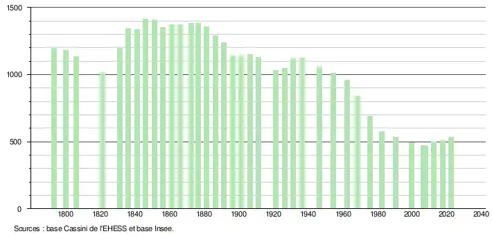 L'évolution du nombre d'habitants est connue à travers les recensements de la population effectués dans la commune depuis 1793. Pour les communes de moins de 10 000 habitants, une enquête de recensement portant sur toute la population est réalisée tous les cinq ans, les populations de référence des années intermédiaires étant quant à elles estimées par interpolation ou extrapolation[32]. Pour la commune, le premier recensement exhaustif entrant dans le cadre du nouveau dispositif a été réalisé en 2007[33].