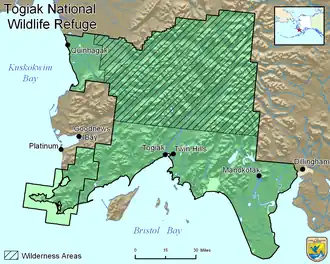 - (en) Cet article est partiellement ou en totalité issu de l’article de Wikipédia en anglais intitulé « Togiak National Wildlife Refuge » (voir la liste des auteurs).