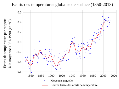 Graphique des écarts des températures globales moyennes de surface par rapport à la moyenne 1961-1990 (basé sur les données du MetOffice).