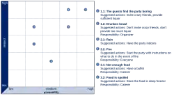 | Invités | Les invités trouvent la fête ennuyeuse | 1.1. | bas | moyen | Invitez des amis fous, fournissez suffisamment d'alcool | Sortez le karaoké | 2 | dans les 2h | |