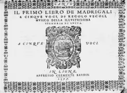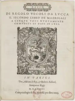 - Di Regolo Vecoli da Lucca Il secondo libro de madrigali a cinque voci... (Paris, Le Roy et Ballard, 1586)[4], cette fois offert à Caterina Burlamacchi (traduction de la dédicace au Doc. 41). Son épître dédicatoire précise qu’il avait quitté Lyon à cause des troubles endurés par la ville. Ce livre fait de lui le premier compositeur de madrigaux dont un livre entier est publié à Paris.