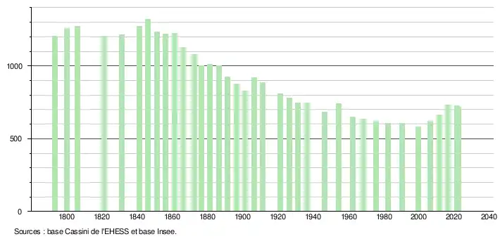 L'évolution du nombre d'habitants est connue à travers les recensements de la population effectués dans la commune depuis 1793. Pour les communes de moins de 10 000 habitants, une enquête de recensement portant sur toute la population est réalisée tous les cinq ans, les populations de référence des années intermédiaires étant quant à elles estimées par interpolation ou extrapolation[35]. Pour la commune, le premier recensement exhaustif entrant dans le cadre du nouveau dispositif a été réalisé en 2006[36].