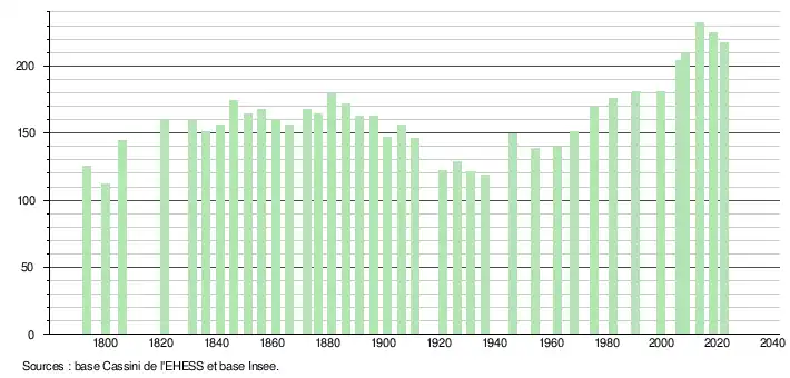 L'évolution du nombre d'habitants est connue à travers les recensements de la population effectués dans la commune depuis 1793. Pour les communes de moins de 10 000 habitants, une enquête de recensement portant sur toute la population est réalisée tous les cinq ans, les populations de référence des années intermédiaires étant quant à elles estimées par interpolation ou extrapolation[35]. Pour la commune, le premier recensement exhaustif entrant dans le cadre du nouveau dispositif a été réalisé en 2008[36].