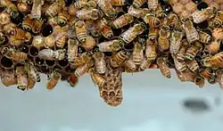 - Cellules d'essaimage : les cellules royales créées avant un essaimage sont généralement nombreuses (une dizaine) et toutes suspendues au bas ou sur les côtés d'un cadre. Lorsqu'on voit des cellules royales pondues et operculées, c'est le signe que l'essaimage est proche (si la météo le permet). Si on souhaite diviser sa colonie, l'utilisation d'un cadre porteur d'une cellule d'essaimage est une très bonne solution car les reines créées lors d'essaimage sont de bonne qualité.