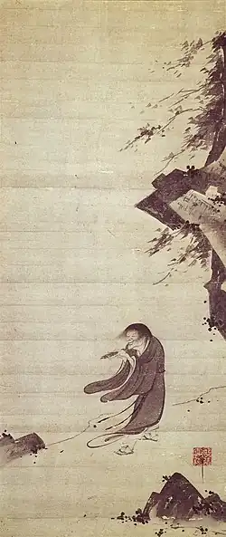 Pour les moines zen, la peinture, et notamment la peinture de paysage, est l'un des plus sûrs moyens de parvenir à l'illumination. On ne peut donc s'étonner de constater qu'entre le XIVe et le XVIe siècle, la quasi-totalité des peintres qui s'illustrent dans le paysage au lavis, et ils sont nombreux, sont des moines. Au XIIIe siècle, l'influence continentale, si déterminante quatre cents ans plus tôt, ne joue plus guère, même si elle est en passe de s'affirmer à nouveau. S'ils préfèrent s'essayer d'abord à l'art intimiste du paysage rapproché, ils s'adonnent volontiers à ces zenkizu (images évoquant les activités familières des bonzes zen) qui enchantent les sages chinois[2]. Reisai nous donne déjà de ces scènes, une vision plus stylisée lorsqu'il peint les deux compères Kanzan et Jittoku (les célèbres moines-clochards de la tradition chinoise), modèles de prédilection de nombreux peintres japonais[3].