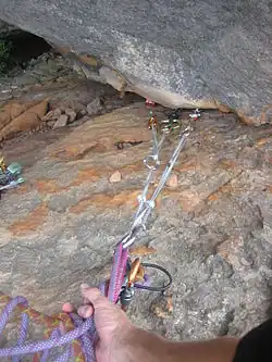 Un ancrage résistant peut être construit sur cet emplacement, mais l'assurage peut aussi être réalisé sans point d'ancrage avec un assurage à l'épaule, en particulier dans les falaises non équipées.