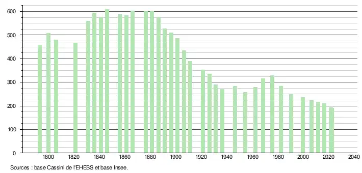 L'évolution du nombre d'habitants est connue à travers les recensements de la population effectués dans la commune depuis 1793. Pour les communes de moins de 10 000 habitants, une enquête de recensement portant sur toute la population est réalisée tous les cinq ans, les populations de référence des années intermédiaires étant quant à elles estimées par interpolation ou extrapolation[27]. Pour la commune, le premier recensement exhaustif entrant dans le cadre du nouveau dispositif a été réalisé en 2006[28].