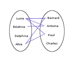 Dans le cas d'un ensemble fini, on peut alors tenter de représenter la relation par un diagramme. Si F = {Lucie, Béatrice, Delphine, Alice} et si G = {Bernard, Antoine, Paul, Charles}, la relation aime peut être schématisée par le diagramme joint (un tel diagramme est dit diagramme sagittal).