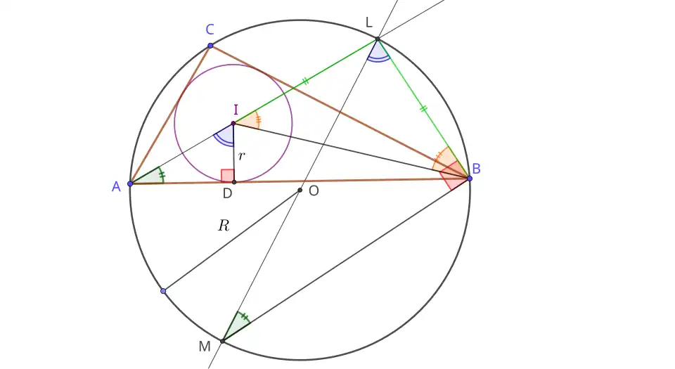 Les angles et sont égaux, puisqu'ils soutiennent le même arc capable. Les triangles rectangles IAD et LMB sont donc semblables puisqu'ils ont un angle non droit identique.