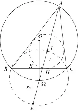 Pour un triangle quelconque, on note O, I, IA les centres respectifs des cercles circonscrit, inscrit, et exinscrit dans l'angle (par exemple), et R, r, rA leurs rayons respectifs.