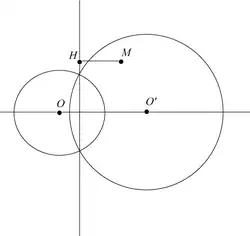 Cette démonstration utilise la propriété suivante des puissances d'un point par rapport à deux cercles[7],[8],[9]. Étant donnés deux cercles de centres O et O', et un point M se projetant en H sur l'axe radical, la différence des puissances de M par rapport aux deux cercles vérifie : .