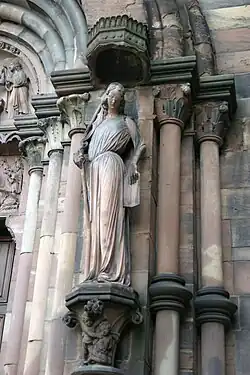 - ↑ Dans son Dictionnaire raisonné de l’architecture française du XIe au XVIe siècle, Viollet-le-Duc remarque : « La synagogue de la cathédrale […] a les yeux bandés ; son étendard se brise dans sa main ; son bras gauche, pendant, laisse tomber les tables. »