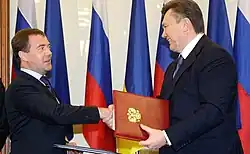 Le , le nouveau président ukrainien Viktor Ianoukovytch a signé avec son homologue russe, Dmitri Medvedev, un traité portant d'une part sur le prolongement pour vingt-cinq ans du bail de la Flotte russe de la mer Noire basée à Sébastopol[21] en Crimée, et d'autre part sur la diminution du prix du gaz russe livré à l'Ukraine de 30 %[20],[22]. Sur le plan militaire, la Russie dispose d'une garnison de 13 000 hommes à Sébastopol.