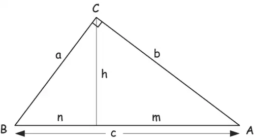 - Dans tous triangles rectangles, « le produit des mesures de l’hypoténuse et de la hauteur correspondante égale le produit des mesures des côtés de l’angle droit[2]. » Selon les côtés nommés dans la figure ci-contre,