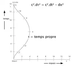 Le temps propre de la trajectoire de la particule est plus court que le temps t mesuré dans le référentiel, contrairement à ce que suggère le dessin.