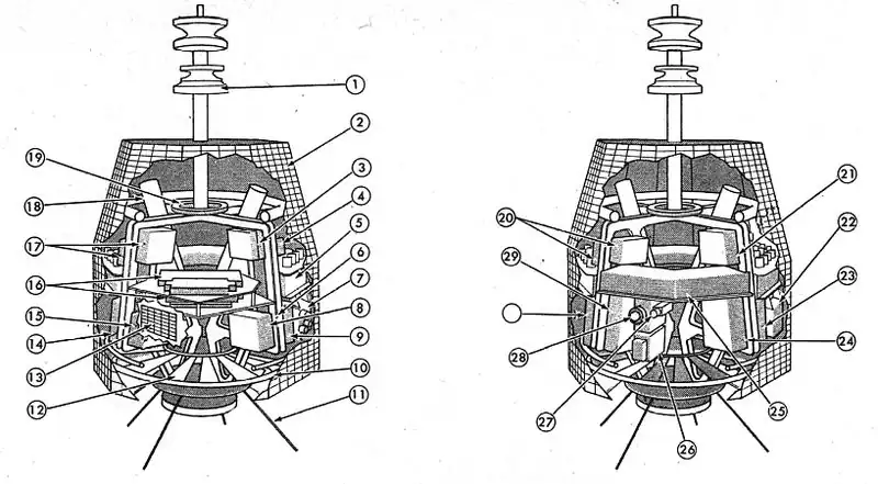 Vue en coupe d'un satellite Relay montrant celui-ci sous deux angles : 1 Antenne bande large, 2 Cellules solaires, 4 et 5 Batteries avec leurs chargeurs, 7 22 et 28 Détecteurs de radiations, 18 Tube à ondes progressives, 19 Amortisseur de nutation, 26 Senseur solaire, 27 Senseur d'horizon.
