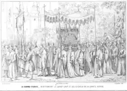 - ↑ On a remarqué cette croix de Lorraine au-dessus du globe terrestre. Ce fait a de l'importance: il ne s'agit pas ici d'un détail purement artistique. Au XVIe siècle, époque de la confection du reliquaire, la maison de Lorraine faisait publier qu'elle était issue de Charles-de-Lorraine, le dernier descendant de Charlemagne. — Sans doute MM. de Guise et de Mayenne étaient de bons catholiques, mais ils étaient aussi de grands ambitieux.