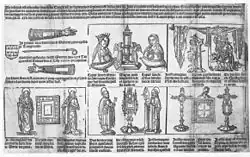 Sur le coin gauche inférieur (cliquer pour agrandir), une statuette de la Vierge dont l'inscription mentionne qu'elle contient une relique du lait de la Vierge[32].