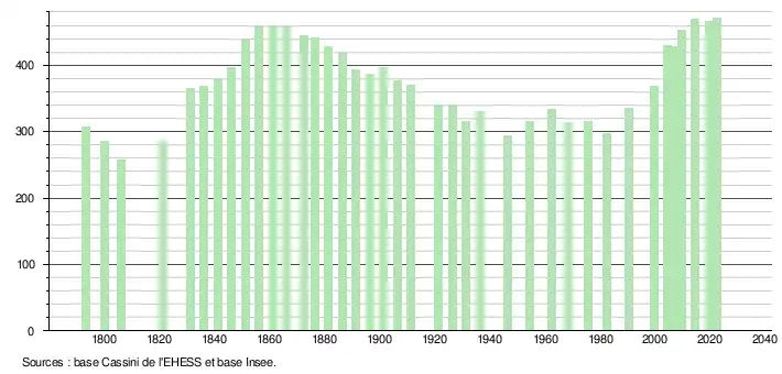 L'évolution du nombre d'habitants est connue à travers les recensements de la population effectués dans la commune depuis 1793. Pour les communes de moins de 10 000 habitants, une enquête de recensement portant sur toute la population est réalisée tous les cinq ans, les populations de référence des années intermédiaires étant quant à elles estimées par interpolation ou extrapolation[35]. Pour la commune, le premier recensement exhaustif entrant dans le cadre du nouveau dispositif a été réalisé en 2004[36].
