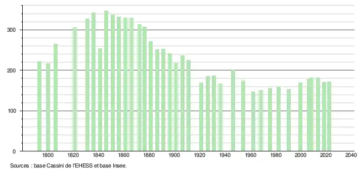 L'évolution du nombre d'habitants est connue à travers les recensements de la population effectués dans la commune depuis 1793. Pour les communes de moins de 10 000 habitants, une enquête de recensement portant sur toute la population est réalisée tous les cinq ans, les populations de référence des années intermédiaires étant quant à elles estimées par interpolation ou extrapolation[25]. Pour la commune, le premier recensement exhaustif entrant dans le cadre du nouveau dispositif a été réalisé en 2008[26].