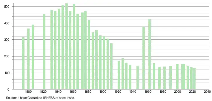 L'évolution du nombre d'habitants est connue à travers les recensements de la population effectués dans la commune depuis 1793. Pour les communes de moins de 10 000 habitants, une enquête de recensement portant sur toute la population est réalisée tous les cinq ans, les populations de référence des années intermédiaires étant quant à elles estimées par interpolation ou extrapolation[17]. Pour la commune, le premier recensement exhaustif entrant dans le cadre du nouveau dispositif a été réalisé en 2008[18].