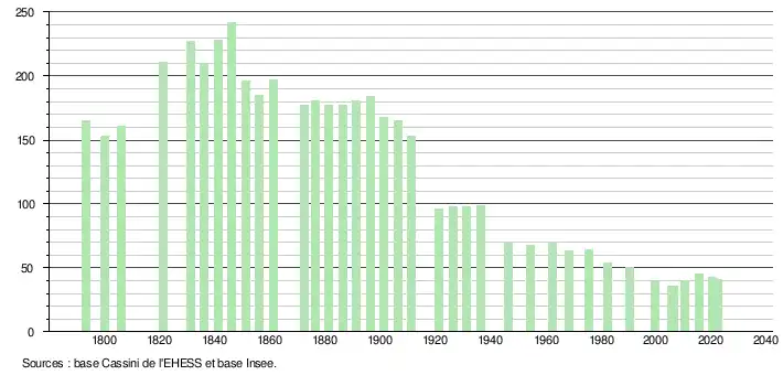 L'évolution du nombre d'habitants est connue à travers les recensements de la population effectués dans la commune depuis 1793. Pour les communes de moins de 10 000 habitants, une enquête de recensement portant sur toute la population est réalisée tous les cinq ans, les populations de référence des années intermédiaires étant quant à elles estimées par interpolation ou extrapolation[16]. Pour la commune, le premier recensement exhaustif entrant dans le cadre du nouveau dispositif a été réalisé en 2005[17].