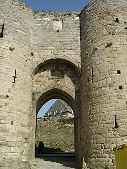 À la suite de l'intégration de la ville au domaine ducal, Jean Ier et ses successeurs entament d'importants travaux de fortification. Trois portes ainsi que beaucoup de tours, ainsi qu'un donjon situé à l'emplacement de l'actuel, sont ainsi construits durant la période de paix durant du début du XIVe siècle au déclenchement de la guerre de succession de Bretagne en 1341[10].