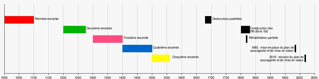 Au XIe siècle, une première fortification est construite, englobant le château féodal et l'église Saint-Genès. Deux portes romanes sont percées dans cette première enceinte permettant de rejoindre le passage du chemin qui mène au bourg. Au XVe siècle, elle est nommée « la murailhe du Palais du Chastel »[Note 1]. La rue principale de ce premier quartier de la ville en marque le souvenir ; c'est l'actuelle « rue du Palais » qui devrait s'appeler « rue du Palais du Chastel »[a 1],[b 1].