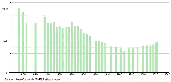 L'évolution du nombre d'habitants est connue à travers les recensements de la population effectués dans la commune depuis 1793. Pour les communes de moins de 10 000 habitants, une enquête de recensement portant sur toute la population est réalisée tous les cinq ans, les populations de référence des années intermédiaires étant quant à elles estimées par interpolation ou extrapolation[13]. Pour la commune, le premier recensement exhaustif entrant dans le cadre du nouveau dispositif a été réalisé en 2006[14].