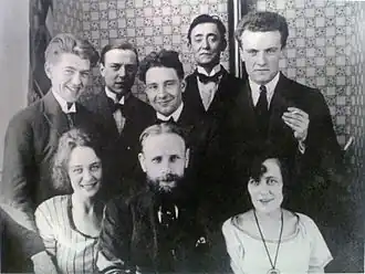 Disposant de beaucoup d'argent grâce aux activités plus ou moins douteuses de son père et aux peintures décoratives ou affiches dont il décroche les commandes, il le dépense, multipliant aventures, blagues et frasques, avec ostentation, dans un climat bohème et anarchiste[12]. Avec Flouquet et les frères Pierre Bourgeois et Victor Bourgeois, il collabore aux quatre numéros, d'avril à , de la revue Au volant que dirige Pierre Bourgeois. Auprès de ses amis il découvre le cubisme et le futurisme. Des œuvres de Flouquet et des affiches puis des peintures non figuratives de Magritte sont exposées en 1919 et 1920 au Centre d'art de Bruxelles dirigé par Aimé Declercq. À cette seconde exposition Magritte rencontre en janvier E. L. T. Mesens, qui sera engagé comme professeur de piano pour son frère Paul.
