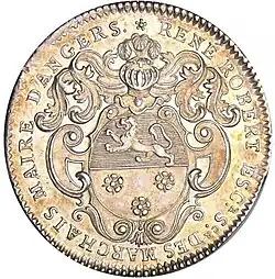 Il porte coupé au premier d'azur au lion rampant d'or, armé et lampassé de gueules, au deuxième d'argent à trois roses de gueules posées deux et une[12]. Il existe trois jetons de René Robert, écuyer, seigneur des Marchais : un premier frappé en 1720, un second en 1724 et un troisième en 1729. Le revers du dernier jeton, qui représente un filet rompu d'où un aigle vient de s'échapper, accompagné de la devise Esto jam Libera (désormais, sois libre), fait allusion à un conflit résolu entre le gouverneur d'Anjou, le prince de Lambesc et l'Hôtel de ville au sujet de l'élection des offices municipaux[13] ; en effet, grâce à l'action de son maire René Robert, la ville d'Angers se voit rétablir en 1729 la liberté (partielle) d'élire maire et échevins. Ce droit lui avait été retiré après les évènements de la Fronde, le roi nommant lui-même le maire sur proposition du gouverneur d'Anjou[14].