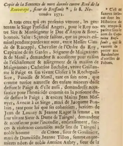La sentence[28] rendue le par « les gens tenans le présidial » rappelait tous les crimes de Bressault. Le chef huguenot fut «< condamné à être par l'Exécuteur de la haute Justice tiré et extrait des dites prisons, et conduit en la place du Pillory de cette ville et là avoir la teste tranchée sur un échaufaut dressé pour cette fin ». Puis il était ordonné, en outre, qu'après l'exécution la tête du décapité « serait portée par l'Exécuteur à Château-Gontier, et mise au bout d'une lance, placée sur la principale porte et entrée de la dite ville »[29]. Pour punition de la félonie commise par la Rouevraye envers le sieur de Racappé, le fief de Bressault avec ses dépendances fut confisqué, selon la Coutume d'Anjou, au profit du seigneur de Magnannes. Bressault était aussi condamné « à être mis et tendu en question extraordinaire pour y être ouï de ses complices auparavant l'execution ». Les parties intéressées recevraient les dédommagements auxquels elles avaient droit proportionnellement aux pertes qu'elles avaient subies, tant en nature qu'en argent.