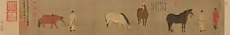 - Deux chevaux et deux hommes, rouleau en longueur, poème signé avec le nom du peintre, attribution.