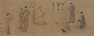 - L'entrevue de Zhang Guolao avec l'empereur Minghuang ou Zhang Guo à l'audience de l'Empereur Brillant[n 2], section d'un rouleau portatif, encre et couleur sur soie, dynastie des Yuan. 41,5 × 107,3 cm.