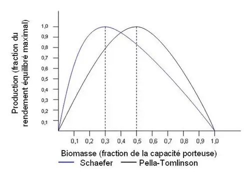 Le modèle de Schaefer s’est rapidement avéré inadéquat pour établir le rendement équilibré maximal de plusieurs espèces de poissons dont la dynamique de la population ne correspond pas à une courbe de production excédentaire symétrique. À la suite de ce constat, le modèle de production excédentaire de Pella-Tomlinson fut développé. Ce modèle corrige le rendement équilibré maximal vers la gauche, illustré par une courbe asymétrique, avec l’addition d’un paramètre additionnel dans le calcul. Ce paramètre est toutefois difficile à estimer pour la majorité des espèces de poisson.