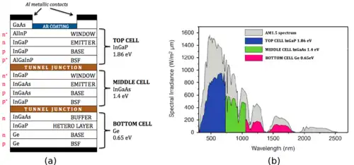 L'empilement de cellules photovoltaïques présentant des jonctions p-n aux largeurs de bande interdite complémentaires permet d'améliorer sensiblement le rendement des modules photovoltaïques en absorbant davantage de photons de longueurs d'onde différentes. Ces réalisations sont techniquement bien plus complexes à réaliser que les cellules à jonction p-n simple car elles doivent superposer des matériaux différents dont les paramètres cristallins ne sont pas rigoureusement identiques et dont les propriétés électroniques peuvent ne pas s'accorder dans le même composant[16]. Un exemple de réalisation présenté ci-contre fait intervenir des électrodes en aluminium sur de l'arséniure de gallium GaAs (Eg = 1,4 eV, a = 565,3 pm) pour les contacts électriques, du phosphure de gallium-indium InGaP (Eg = 1,86 eV, a = 545,1 pm) pour la cellule supérieure, de l'arséniure de gallium-indium InGaAs (Eg = 1,2 eV, a = 586,8 pm) pour la cellule intermédiaire, et du germanium Ge (Eg = 0,65 eV, a = 565,7 pm) pour la cellule inférieure. De telles cellules à multijonction, également dites en tandem, offrent des rendements approchant de 40 % sous un soleil AM1.5G[17].